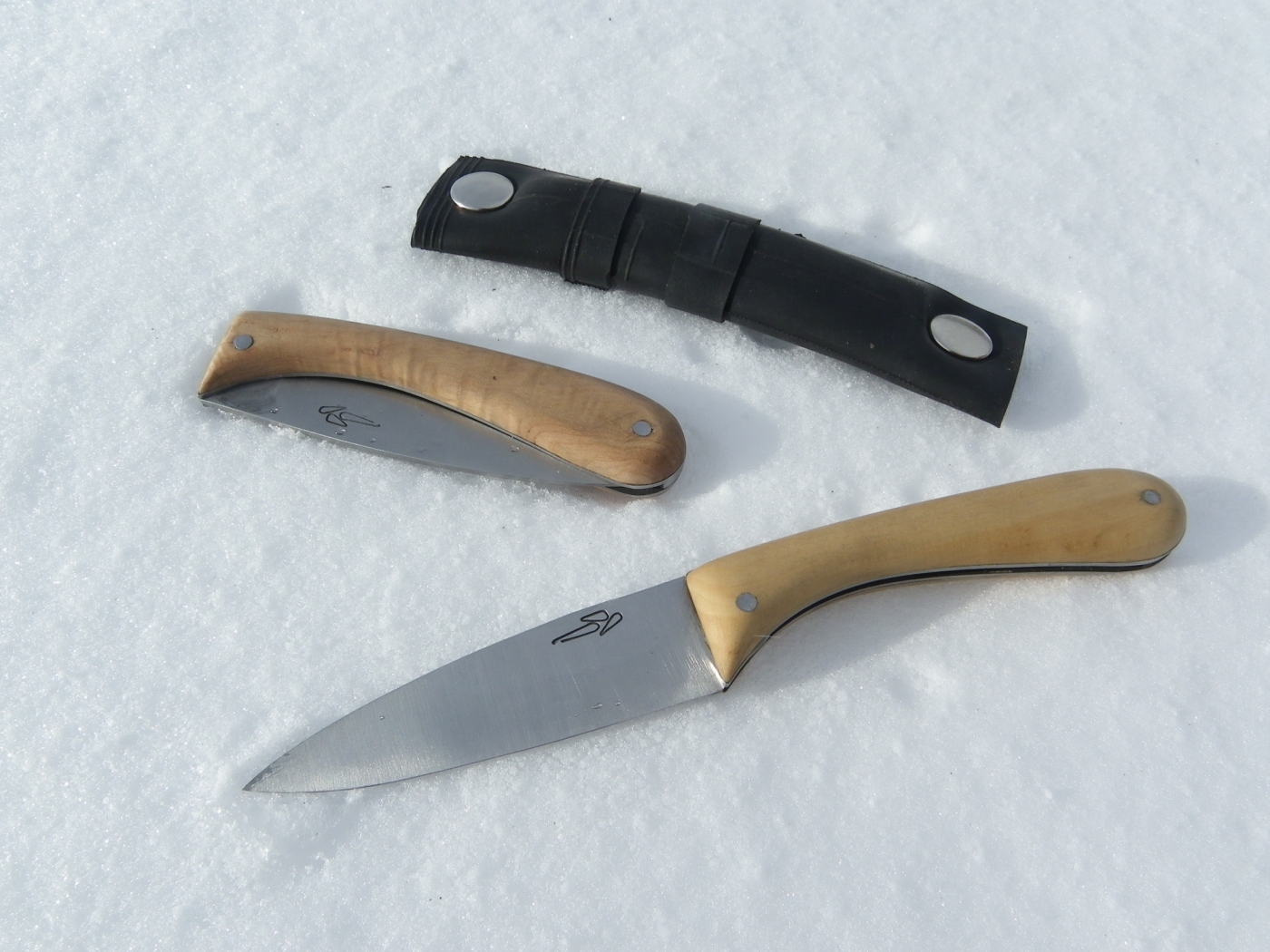 Navajas hechas con varias laminas de diferentes metales, hechas a mano en mi fragua, llevándolas cerca del punto de fusión para poder soldarlas a calda. Esta técnica japonesa de aceros laminados, san mai y gomai, además de darle gran belleza a la hoja le aporta unas características expectaculares.
