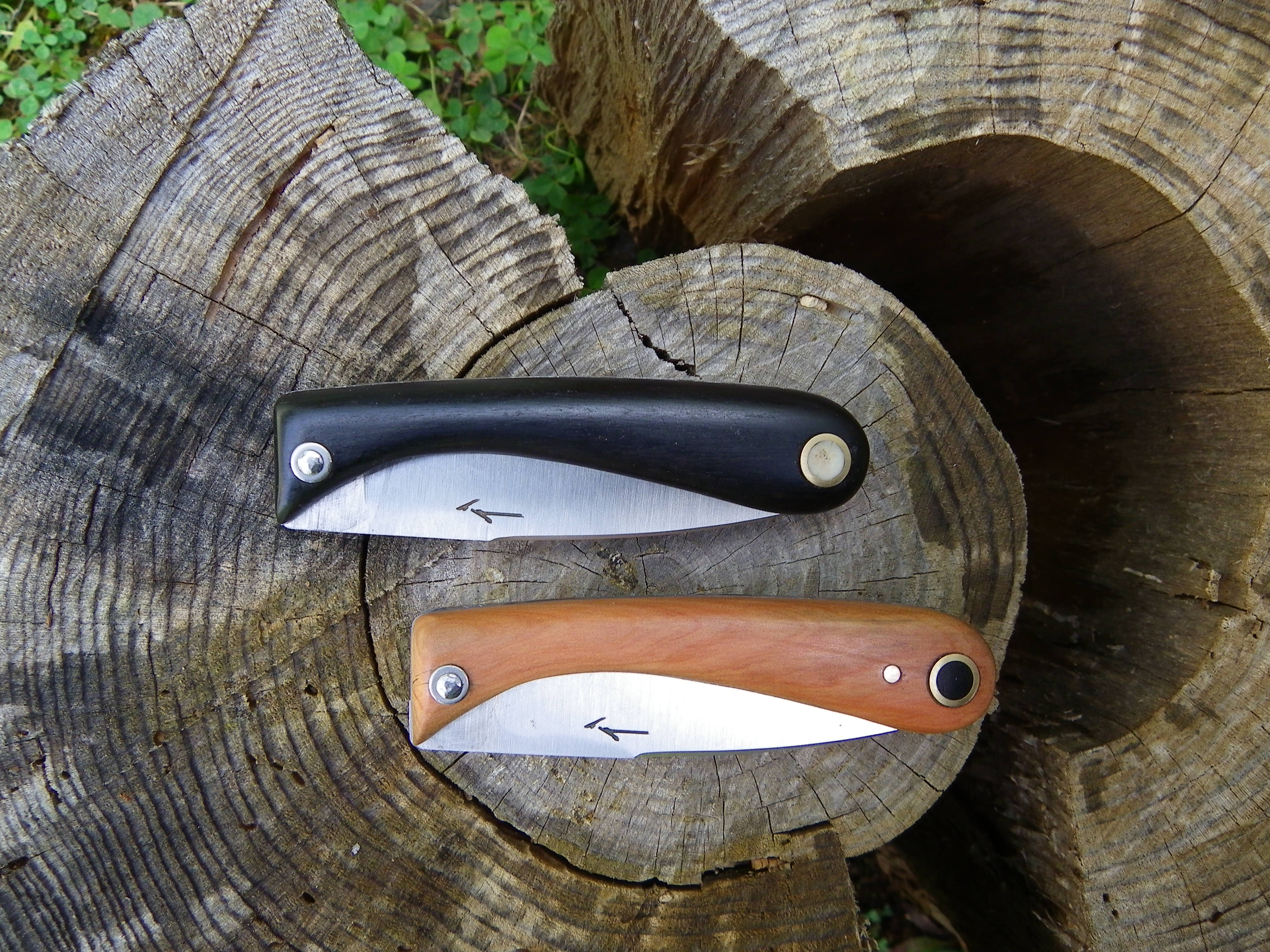 Navaja de ébano con incrustaciones de latón y hueso y navaja de enebro con incrustaciones de latón y ébano.